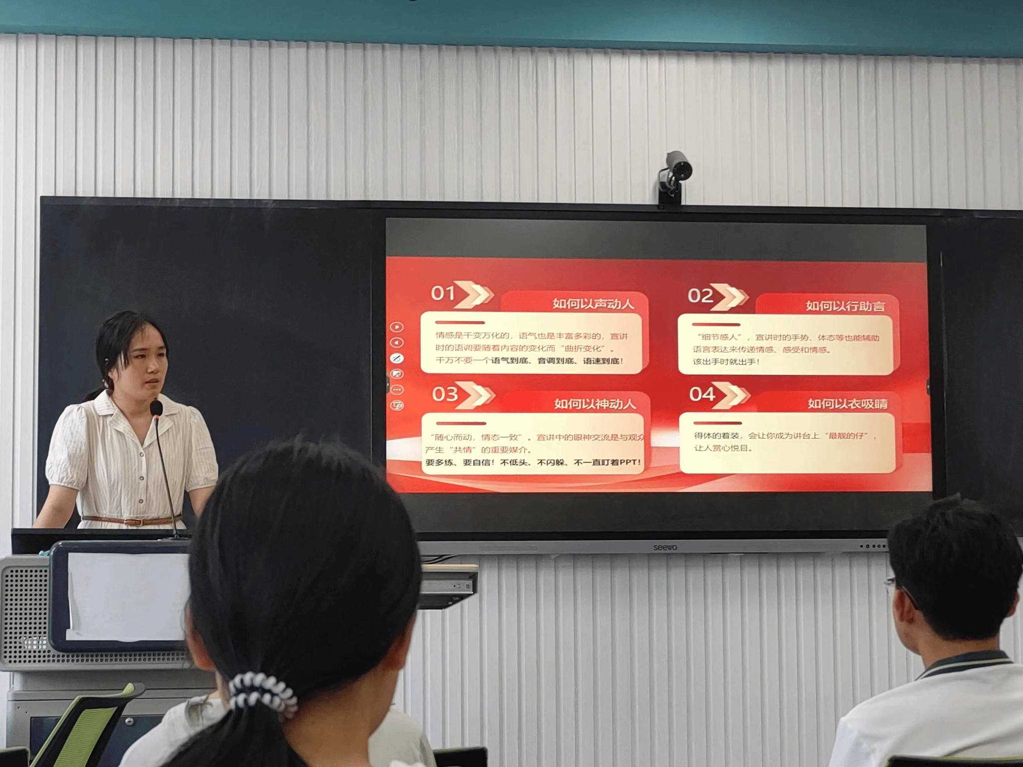 最后老师为大家传授了宣讲技巧,并从如何以声动人,如何以行助言,如何以神动人,如何以衣吸睛四个方面讲述了如何使自己的宣讲更加完美。