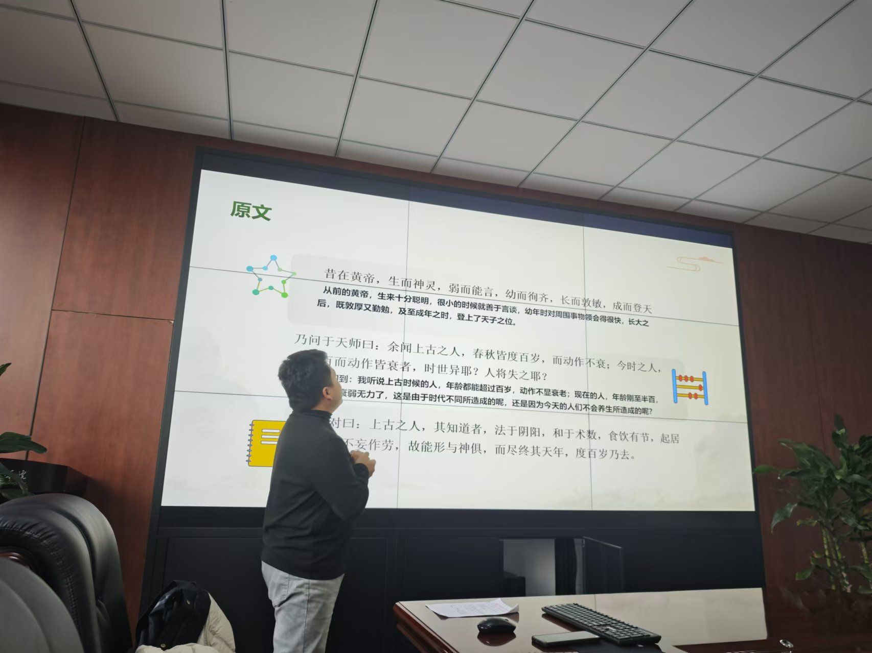 本次分享会活动主要由马克思主义社团周长强同学分享自己阅读《黄帝内经》书籍的学习感悟。他以“中医大美”为主题展开此次的分享,《黄帝内经》是中医学四大经典之一,被誉为“医之始祖”,涵盖生理、病理、诊断、治疗及预防养生等方面的理论知识,展现了医学和文化的双重价值。该书以对话形式阐述阴阳五行、藏象经络等理论,并提供临床经验与治疗方法。同学们可以通过研读《黄帝内经》,可以帮助我们采撷丰富的中医知识,培养正确的中医思维。