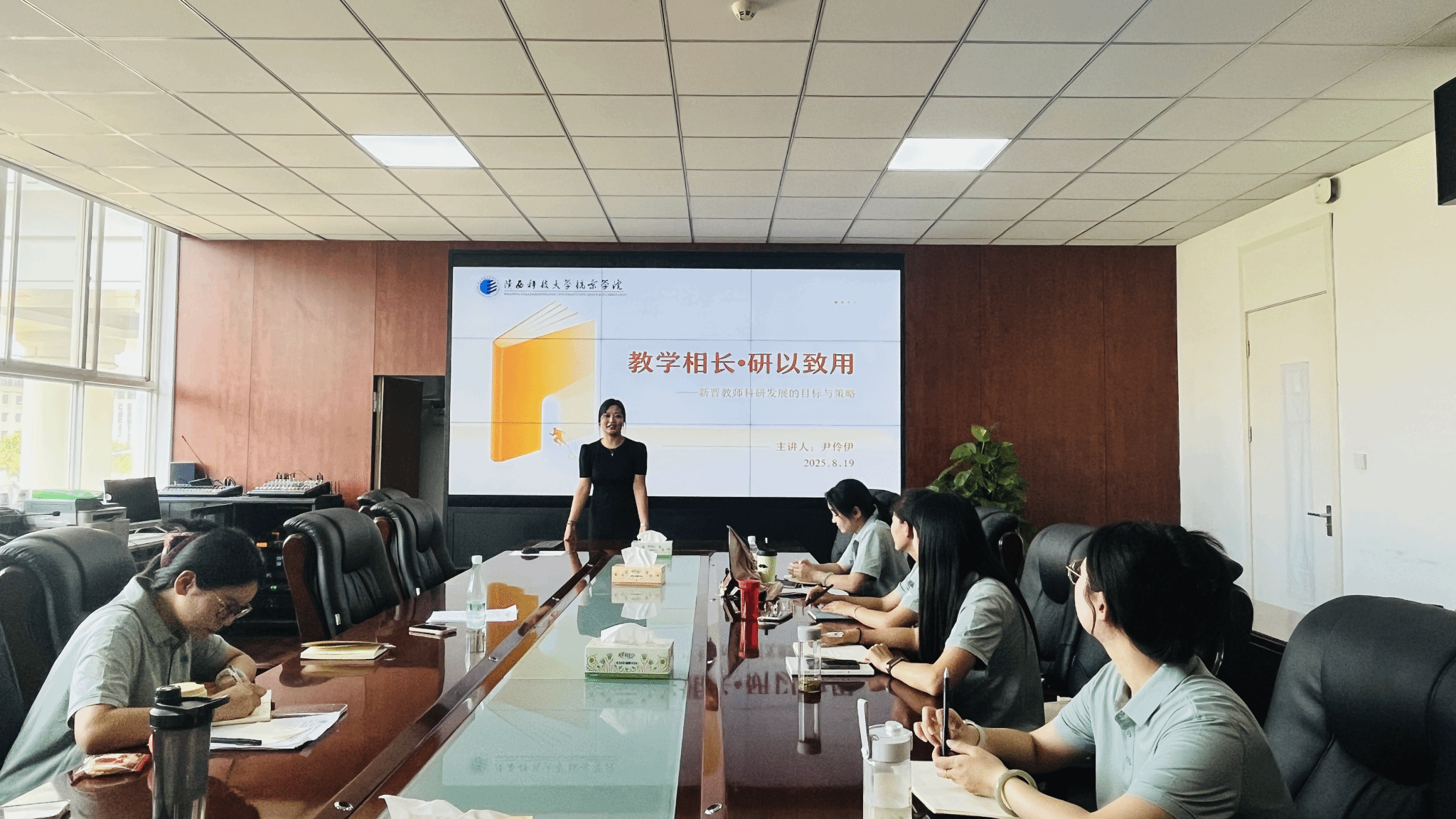 当日下午,尹伶伊副教授以“教学相长・研以致用:新晋教师科研发展的目标与策略”为题开展专题分享。尹老师从个人职业发展历程切入,结合教学与科研相互促进的实践经验,系统讲解了科研目标设定的核心要点,为新教师明晰了科研道路的前进方向,助力大家实现教学与科研的协同发展。